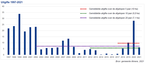 Voor de middellange termijn tot 2030 is er zo’n 35-60 hectare aan vraag te verwachten exclusief ruimtevraag als gevolg van transformatie of herprofilering van bedrijventerreinen of incidentele grote (internationale ruimtevragers (BCI, 2022). Als gekeken wordt naar de uitgiftes van bedrijfsgronden van het afgelopen decennium, dan valt op dat tot het jaar 2002 er nauwelijks problemen waren met de uitgifte van gronden en daarna de uitgifte terugviel naar een langjarig gemiddelde van circa 3 hectare per jaar. Vanaf 2018 zien we de gronduitgifte voor bedrijventerreinen weer sterk toenemen.
